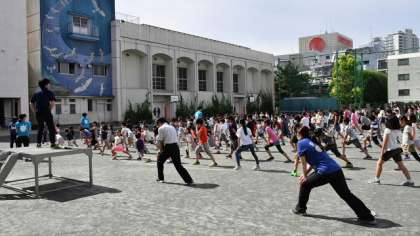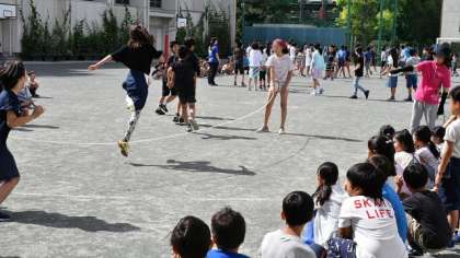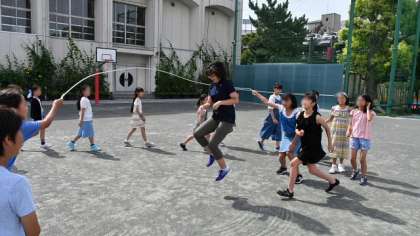 6月22日、この日から学校公開を行いました。朝は、1年生と5年生が一緒に体育朝会を行いました。この日は5年生が1年生に長なわ跳びを見せました。その後1年生も挑戦です。