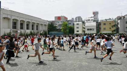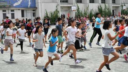 本校では、中休みの最後の5分間、定期的に「運動タイム」を行い、運動に親しむ習慣を身につけるようにしています。6月22日の中休みのようすです。