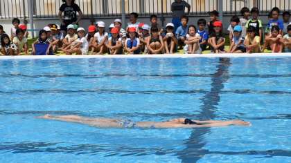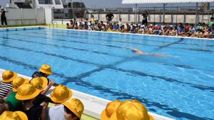 2校時目は、プールで1・2年生が金藤さんの泳ぎを見せていただきました。スタート位置から壁を蹴って体を伸ばして進む「蹴伸び」だけで20mあまりを進むのを見て、歓声が上がりました。うまく泳ぐコツなども実演していただきました。