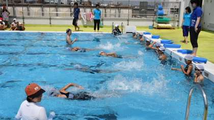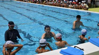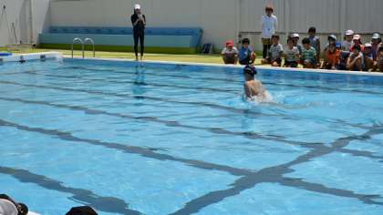3校時は3・4年生がプールで実演見学と、代表児童がプールに入って指導を受けました。金メダリストの華麗な泳ぎに感動です。