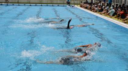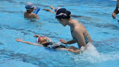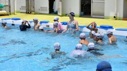 4校時は5・6年生です。代表が参加して、指導していただきました。金メダリストと一緒に泳げて大感激です。練習のポイントもご指導いただきました。