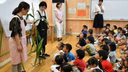 11日(月)、1年生がこの日の給食に提供されるトウモロコシむきを行いました。ランチルームでトウモロコシについて図書館司書から話を聞いた後、栄養士からむき方を習いました。皆さんは、トウモロコシのひげ1本1本と実がつながっていたって知っていましたか?