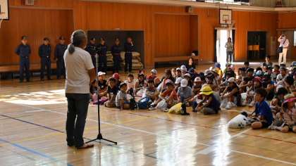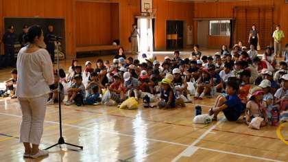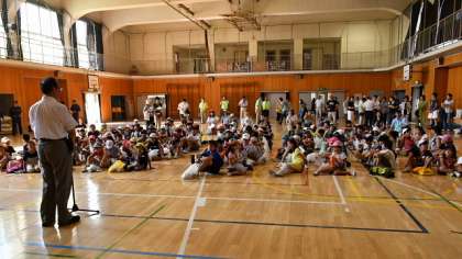 20日(木)、毎年、終業式の日の午後からの恒例行事になっている「避難所宿泊防災訓練」が行われました。参加申し込みをした児童・保護者、運営スタッフとしてPTAの役員さんとプランナーさん、区の関係機関と消防署・消防団の皆様が体育館に集まり、開会式を行いました。