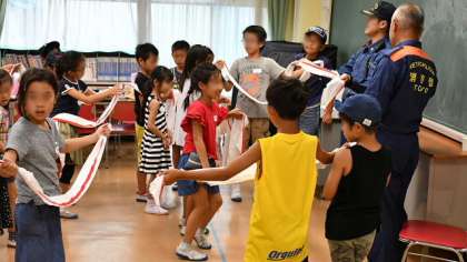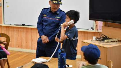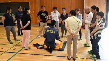 訓練のようす。上から、通報訓練、応急救護訓練、大人によるAEDの使用法訓練。