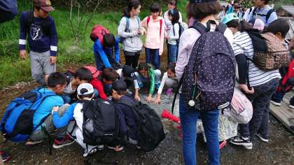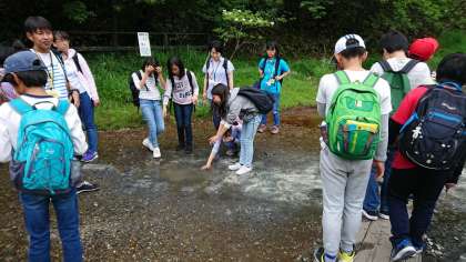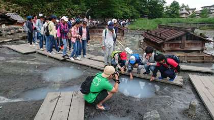 源泉を見学します。あちこちの水たまりのようなところからもお湯が沸いています。興味津々の子どもたちです。