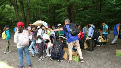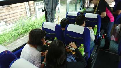 雨が降ってきました。湯滝の駐車場へバスに来てもらって、車内で昼食をとりました。
