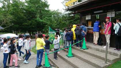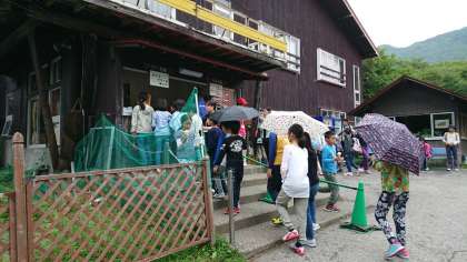 天気予報が雨のため、戦場ヶ原ハイキングは中止して、まずは光徳牧場に向かってアイスクリームを食べます。列に並んで、順番待ちです。
