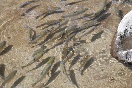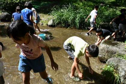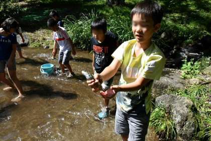 ふじやまビレジについて、昼食を食べた後のマスつかみ体験のようすです。