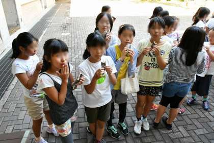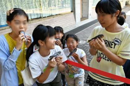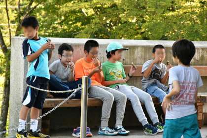捕まえたマスは、ビレジの職員がさばいて串焼きにし、1時間後にできあがりました。みんな、ワイルドにかぶりついていました。