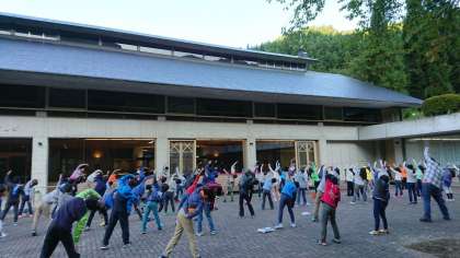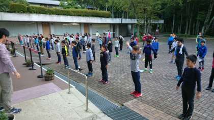 朝会はラジオ体操から始まり、体をしっかり動かして体を目覚めさせます。校長講話では川場の自然について話しました。