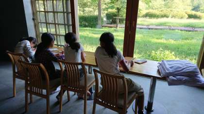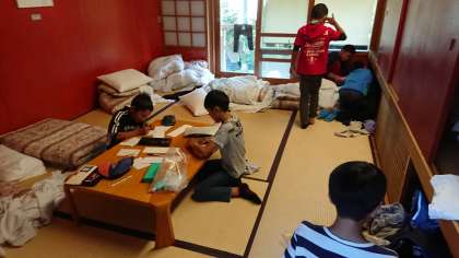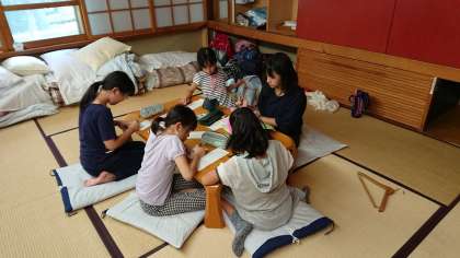 部屋に戻り、荷物の片付けをした後、家族へのはがきを書いています。