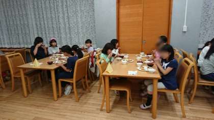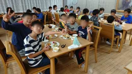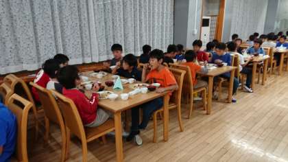 夕食の風景です。今日はたくさん歩いたので、さすがにお腹が減っているようで、よく食べています。