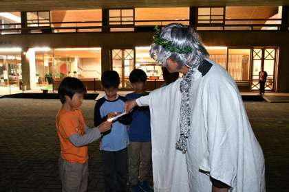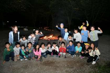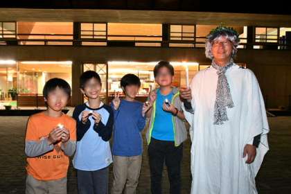 キャンプファイヤーは無事終了。係児童が集まって記念撮影。ビレジに戻ってから、体調不良で参加できなかった「火の子」役の子とささやかなキャンドルサービスをしました。