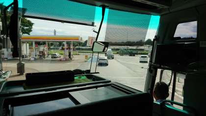 三芳パーキングエリアでトイレ休憩。14時45分にバスは出発しました。