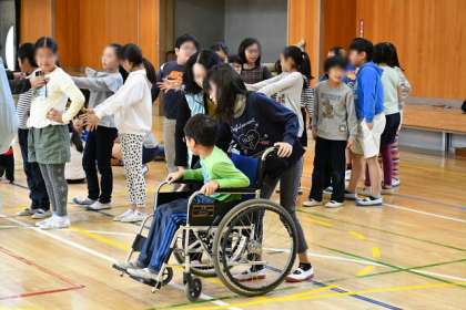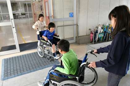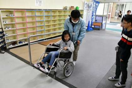 車いす体験では、二人一組になって、設定されたコースを進みます。車いすに乗ってみると、「思ったよりスピード感がある」とか「ちょっとした段差でも大変だ」といった感想が出ていました。