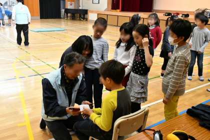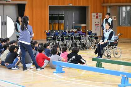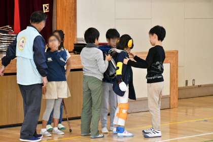 高齢者体験では、高齢になってくると目が見えにくくなったり、膝などが曲がりにくくなったり、体重を支えるのも大変といったことになります。それを体験するために様々な装具をつけて、みんなで試してみました。普段自分たちが、当たり前にできることが難しいという体験をして、高齢者に対する思いやりを育てます。