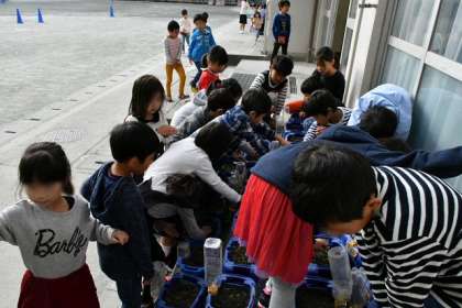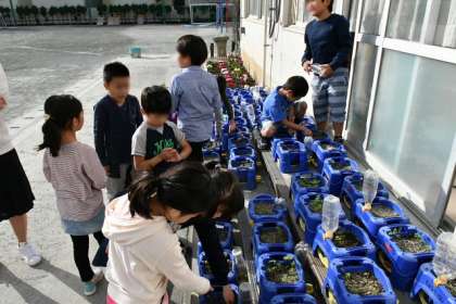 2年生が校舎の前に並べた鉢植えで、ミニキャロットの栽培をしています。少しずつ大きくなっているようすを、ご来校の折にご覧ください。