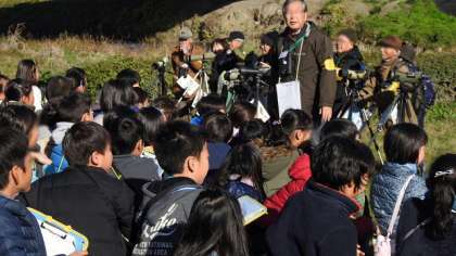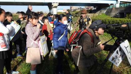 6日(火)、3年生が多摩川河川敷に出かけて、探鳥会を行いました。この日もせたがやトラストの皆さんにご指導いただき、保護者の皆さんにも安全管理でご協力いただきました。