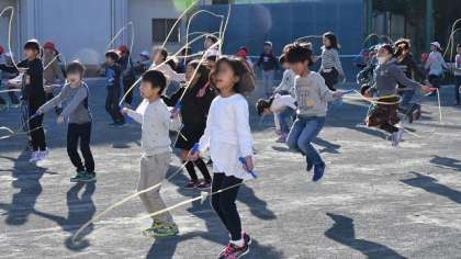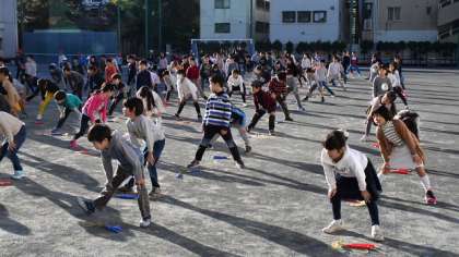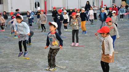 6日(水)、1・2年生が校庭で体育朝会をしました。前回からなわ跳びに取り組んでいます。音楽に合わせてなわ跳びをすることが目標です。寒い朝でしたが、入念に準備運動をして、元気よく跳びました。