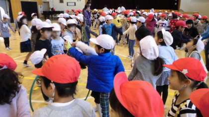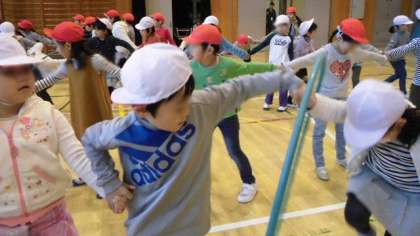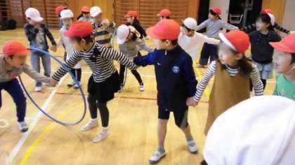 続いて「輪くぐり」。先日、児童集会でやったゲームで、フラフープを隣の人と手を話さずに送っていきます。