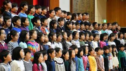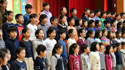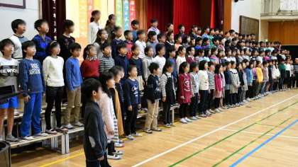 4年生は「もみじ」と「いつだって!」です。大人みんなが、おそらく一度は歌ったことがある曲「もみじ」を歌詞を大事に情景が見えるように歌いました。2曲目の「いつだって!」は掛け合いの部分があったり、ハーモニーがあったり結構難しい歌なのですが、しっかりと表現することができました。