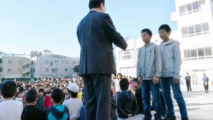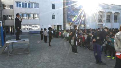 11日(月)、朝会は冷え込んだ空気の中、校庭で行いました。校長講話では、ノーベル賞受賞式の話題から、アルフレッド・ノーベルの話をしました。また、今週の火・水・木曜日のユニセフ募金について、栄養失調でこんな細い輪に通ってしまうほど手首が細くなってしまっている(写真中段)子が世の中には存在することを話しました。続いて、スポーツ少年団野球部の表彰をしました。