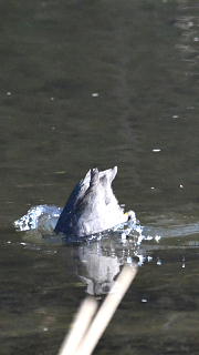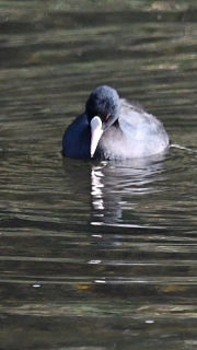 今年は野川で数多く見ることができるオオバンです。真っ黒な体に、くちばしの淡いピンクが目印です。しきりに水底の水草を食べていました。