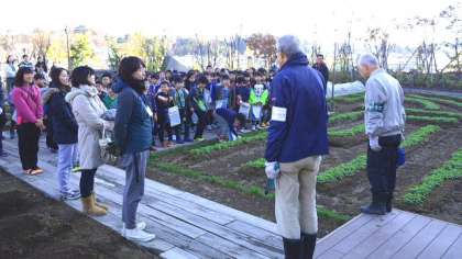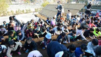 11日(月)、2年生は探鳥会の帰り道、ライズ菜園に寄って、種まきをしてきました。サツマイモでもお世話になった「銀雄クラブ」のみなさんにご準備・指導いただき、春先に黄色い花を咲かせる「カラシナ」の種をまきます。