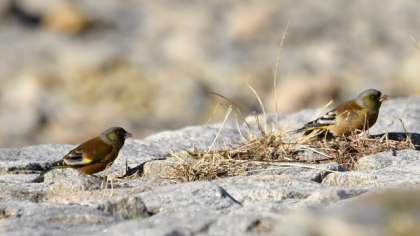 この日は、多摩川のこちら側の河原に「カワラヒワ」が群れでいて、アップで写真が撮れました。下の写真の左がオスで右がメスです。