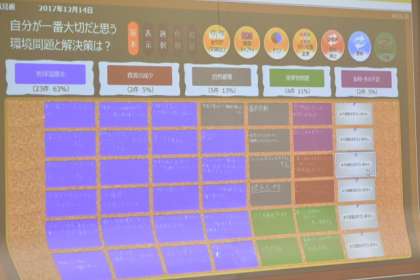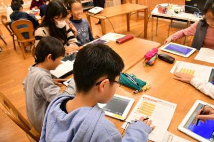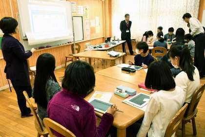 会社の社員さんが各クラスに4・5名ついてアドバイスしてくださりながら学習が進みました。意見の集約なども、タブレット端末を通じてスクリーンに映し出すなど、さすが情報関連会社といったところです。