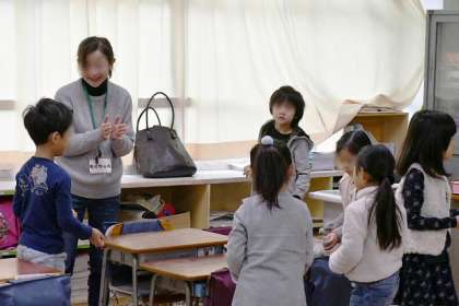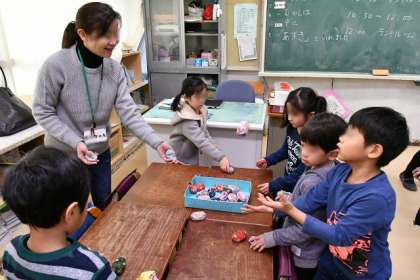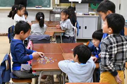 各教室に昔遊びのコーナーを設定して、支援団体の皆さんが指導してくださいました。写真は、「お手玉」と「おはじき」のコーナーです。