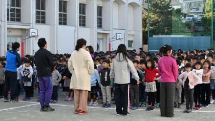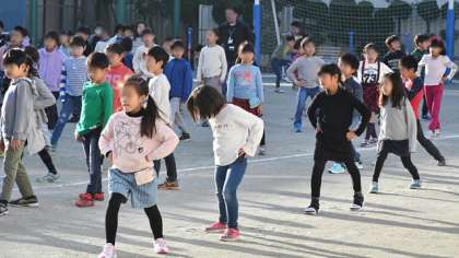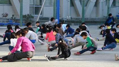 16日(火)は1・2年体育朝会を行いました。きっちり予定の開始時刻8時25分には、ほとんどの児童が集合でき、準備運動を念入りに行いました。