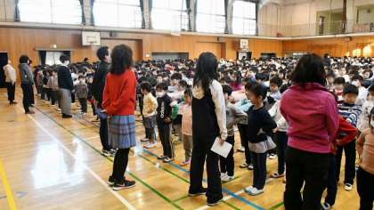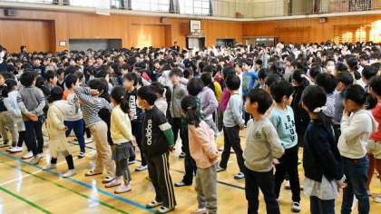 29日(月)の朝会は体育館で行いました。この日も冷え込みが厳しかったのですが、寒い体育館でも話はしっかりと聞くことができて立派です。
