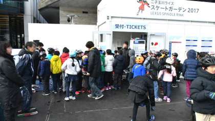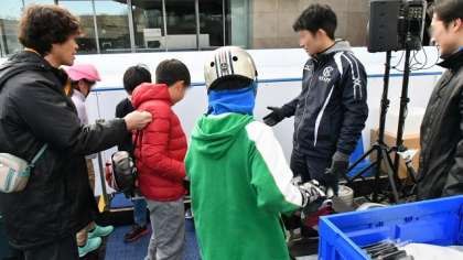1月30日(火)、本校としては初となるスケート教室が始まりました。近隣の複合施設「二子玉川rise」に冬季に設置されているスケートリンクを使用して、4・5年生の体育として位置づけて実施するものです。この日は4年1・2組です。学校からリンクに出かけ、現地スタッフの皆さんと挨拶した後、さっそく準備体操をしてスケート靴を借りて、きちんと履くところから始めます。