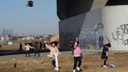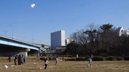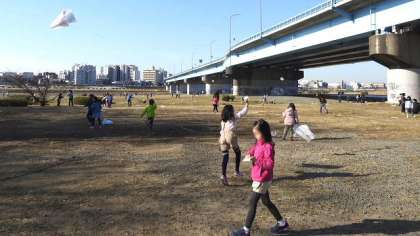 1月31日(水)、降雪のため延期していた多摩川河川敷での「たこあげ」に、2年生が学年で出かけました。兵庫島公園付近で、生活科で作った手作りたこをあげます。天気はよかったのですが、残念ながらこの日は風が弱く、揚げるためには糸をもって走り回らなければなりません。そこは元気な2年生。元気に走り回っています。