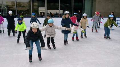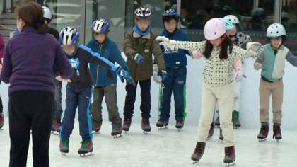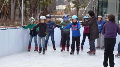 初心者グループは氷上を一歩一歩歩くところから練習します。最初はおっかなびっくりですが、子どもたちの上達は早い!