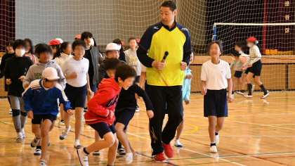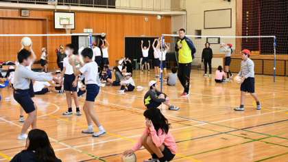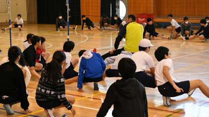 最後は6年生のバレーボール教室です。一緒に走ったり、トレーニングの仕方を教わったり、基本的なパスの仕方を教わったリしました。