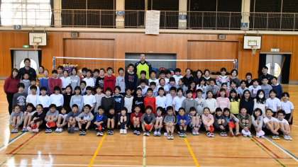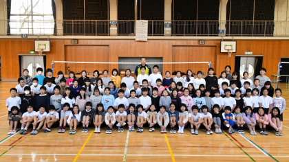 5・6年生も記念撮影をさせていただきました。お手伝いいただいたPTAバレーボール部の皆さんと齋藤選手が記念撮影。お手伝いありがとうございました。今年度は7月にリオオリンピック平泳ぎ金メダリストの金藤選手、今回は北京オリンピックのバレーボール代表選手の齋藤選手と大物のオリンピアンが来校してくださいました。じつはこれ、本校の学校支援コーディネーターの方からの紹介です。二子玉川小の子どもたち、恵まれていますね。齋藤選手、子どもたちへの大サービス、本当にありがとうございました。