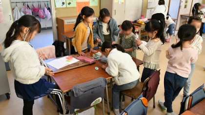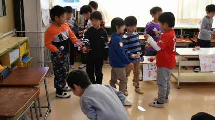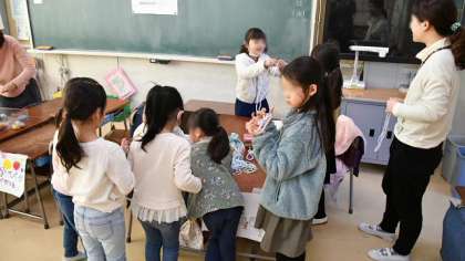 教室では1年生が歓迎と遊びの準備をして、保育園児を迎えます。一緒に剣玉やお手玉、おはじきやあやとり、コマなどで遊びました。