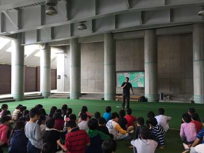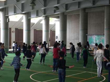 寒さのため、マスつかみはできませんでした。そのかわりに縄跳び名人と一緒に縄跳びをしました。