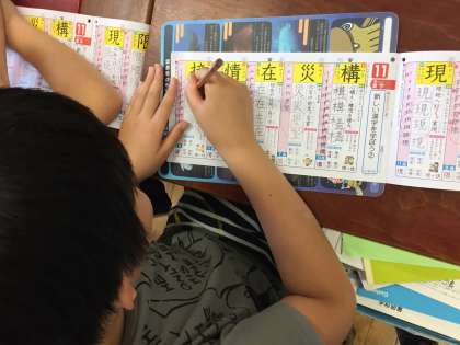 新出漢字の学習。指書き、なぞり書きと丁寧に練習してます。
