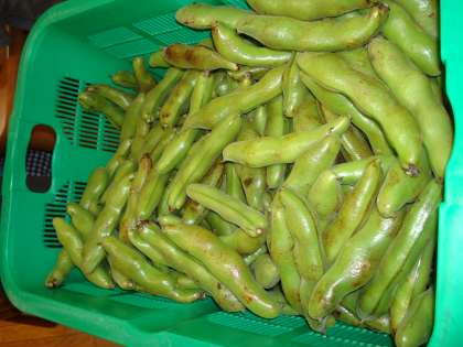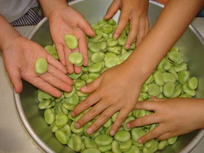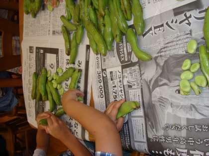 4月のグリンピースにつづいて1年生が給食で使うそら豆のさやむきをしてくれました。
