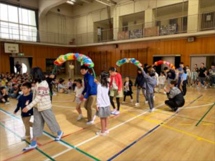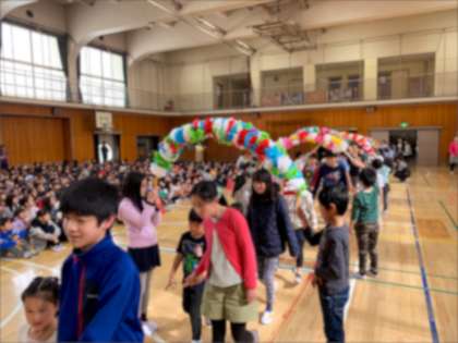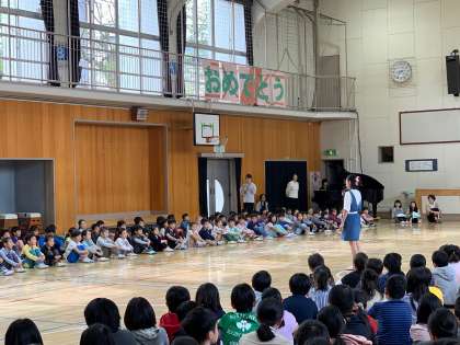 1年生を迎える会が行われました。1年生と6年生が手を繋いで入場です。