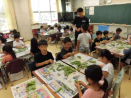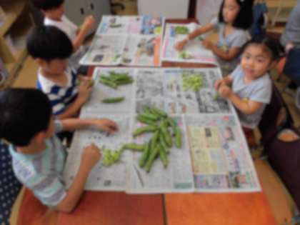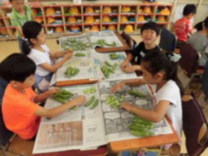 1年生がそら豆むき体験を行いました。むいたそら豆は、給食に出されました。