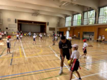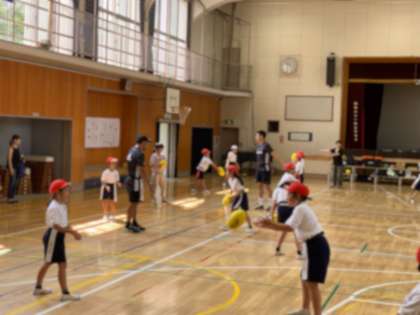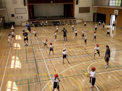 リコーラグビー部の皆さんを招いて、タグラグビーの授業が行われました