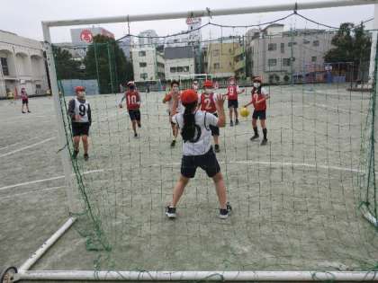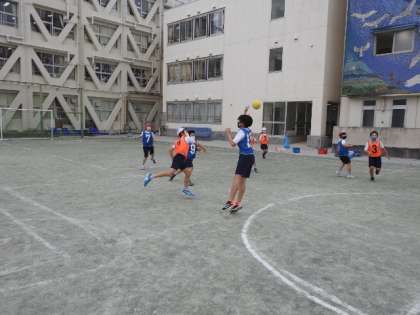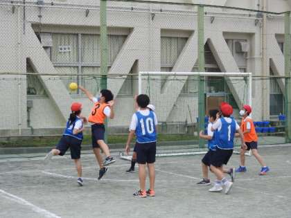 ハンドボールの単元に入りました。チームで作戦を考えたり、みんなでルールを考えたり楽しく取り組んでいます。