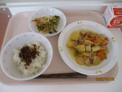 ごはん かみかみ佃煮 牛乳 肉じゃがうま煮 油揚げ入りおひたし