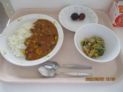 夏野菜のキーマカレーライス 牛乳 めかぶサラダ 巨峰