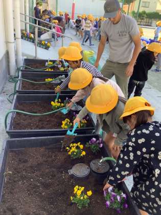 花と緑に親しみ・育てることで情操面の向上を目的としています。世田谷区の農家の方に来ていただき、パンジー・ビオラ・チューリップの球根の植え方と育て方を教えていただきました。