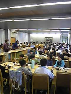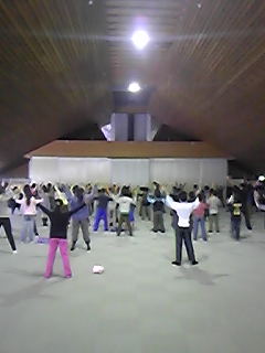 体育館くらいの広さの村の会堂(屋内施設)で朝会、ラジオ体操。その後朝食をとりました。スケジュール通り進行する予定です。みんな元気です。